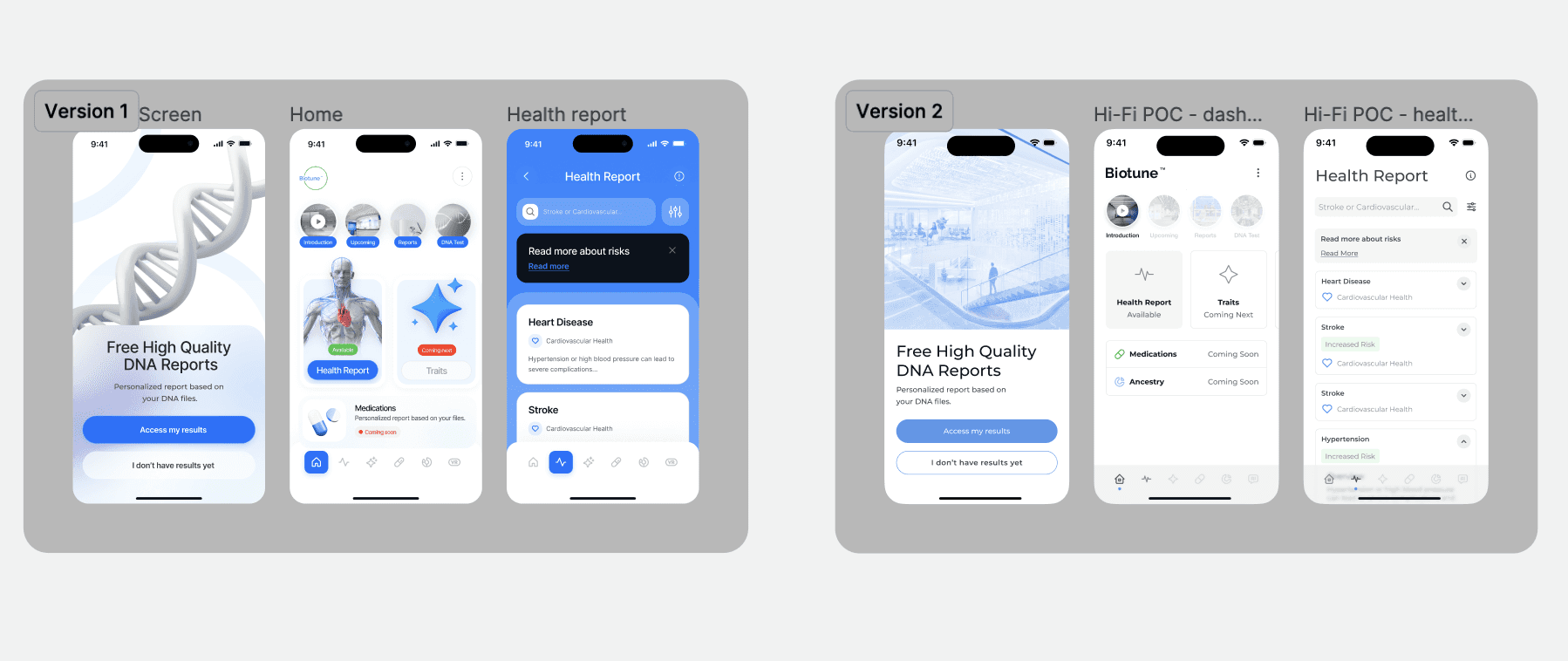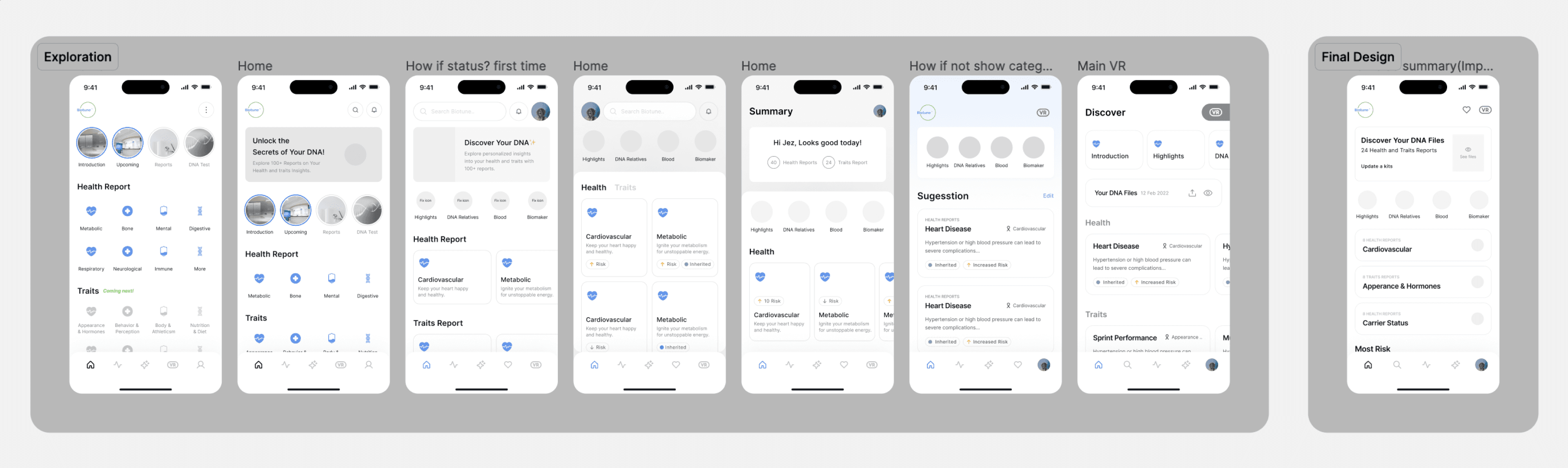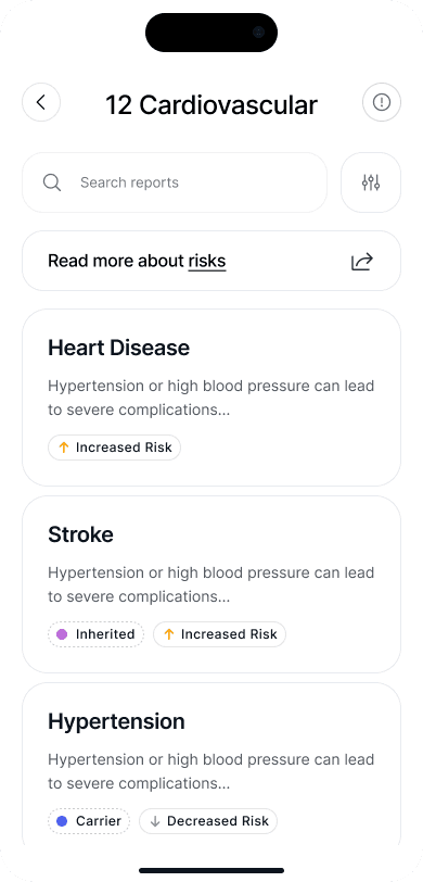Based on feedback, the home screen design was iterated to include prioritized most actionable health insights while allowing easy navigation to deeper health and trait reports. Personalized Elements introduced spaces for user-tailored recommendations (cardiovascular, carrier status, etc.) based on their unique genetic profile.