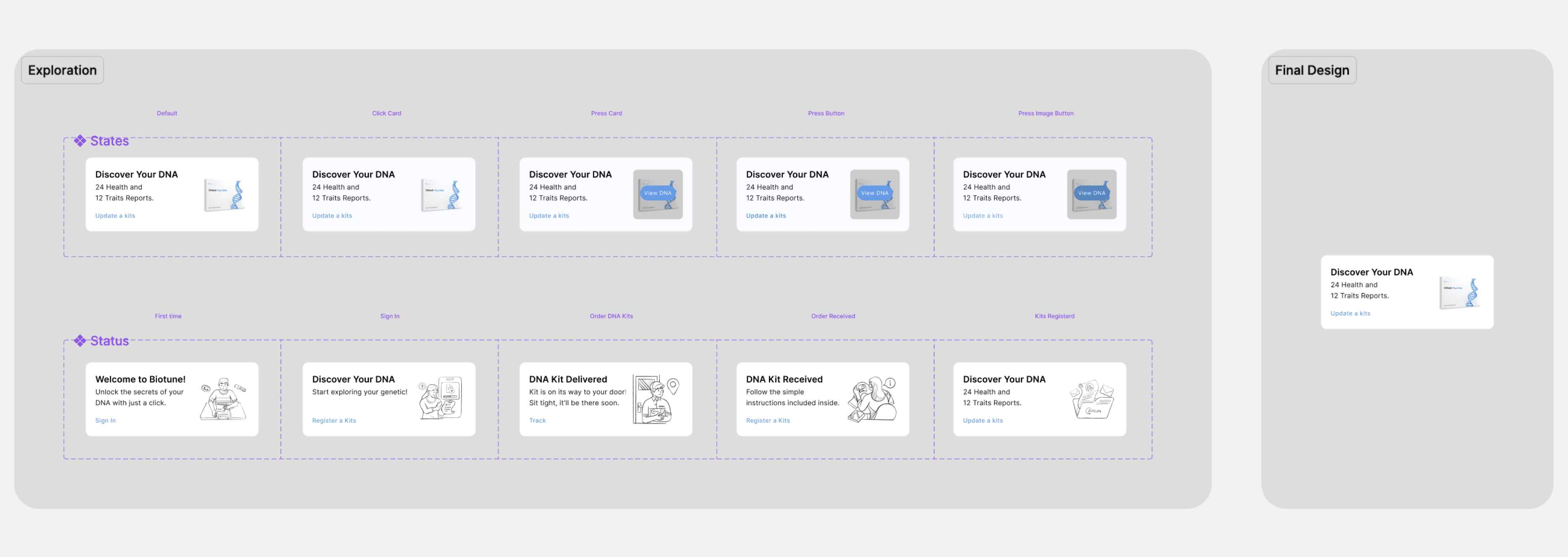 Signed In (No DNA Kit): Focus shifts to promoting the process of ordering a DNA kit. Contain educational tidbits about what Biotune analyzes.