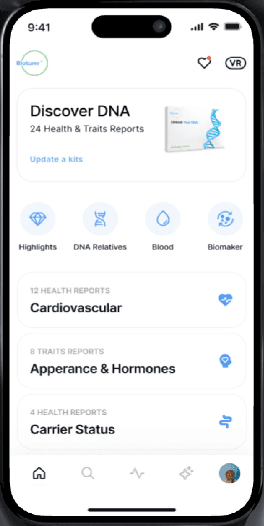 Biotune App is DNA-Based Health & Traits Report Application who designed to provide users with personalized insights into their genetic health risks and unique traits based on DNA analysis.